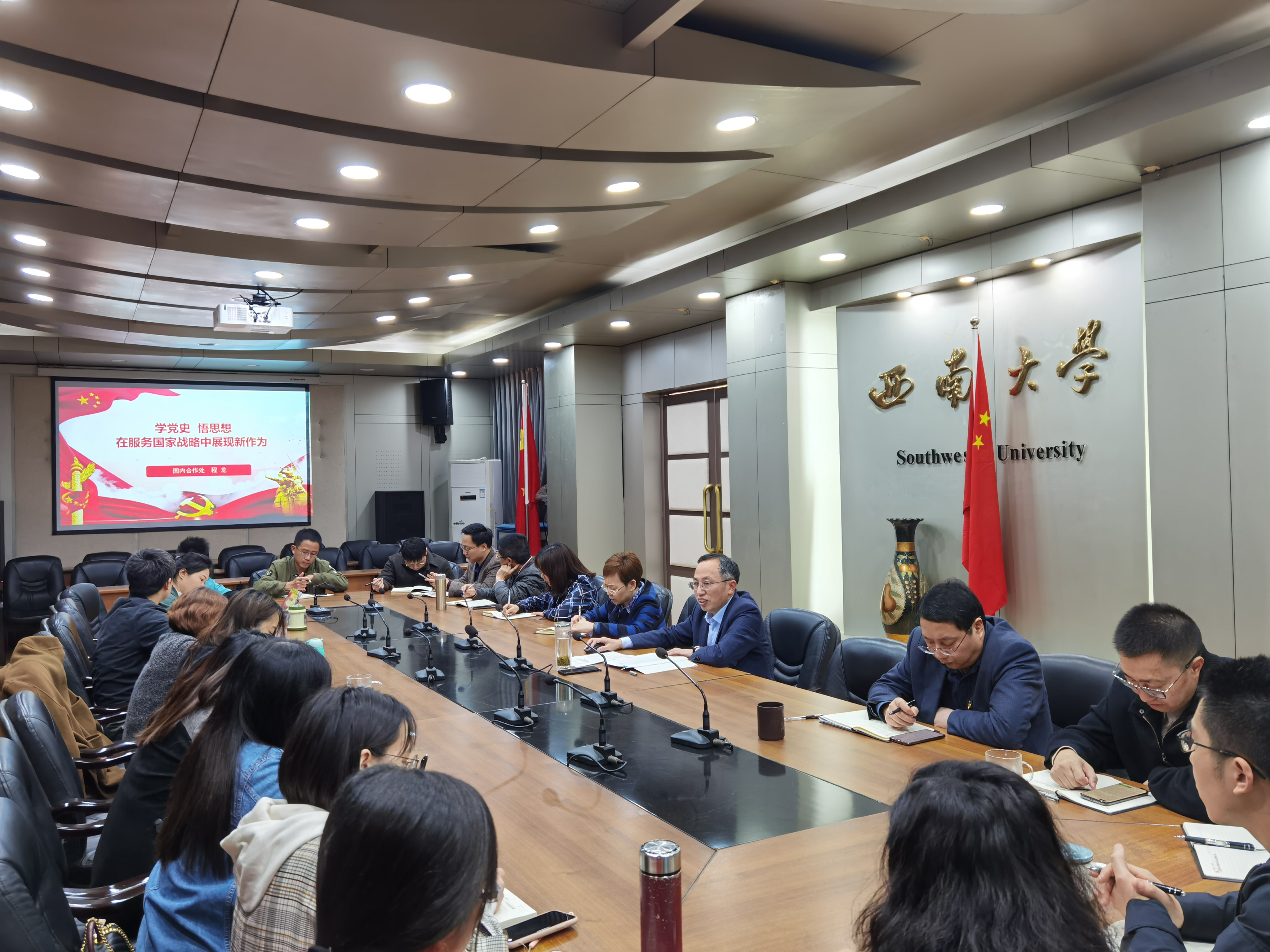 在此基础上,国内合作处还积极将党史学习教育与业务工作推进相结合,开展了“传承红色基因,服务乡村振兴”活动,深入学院和荣昌校区等相关单位调研社会服务工作,帮助学院谋划十四五社会服务和服务乡村振兴工作;赴宜宾市、涪陵区、重庆市畜牧科学学院进行考察交流,推进区校、院校合作;赴城口县、昌宁县开展对口帮扶工作,推进巩固脱贫攻坚成果与乡村振兴有效衔接。切实将党史学习教育融入到社会服务工作中去,学思践悟,在百年党史中汲取力量,增加使命感和责任感,为学校“双一流”建设和服务国家战略贡献力量。