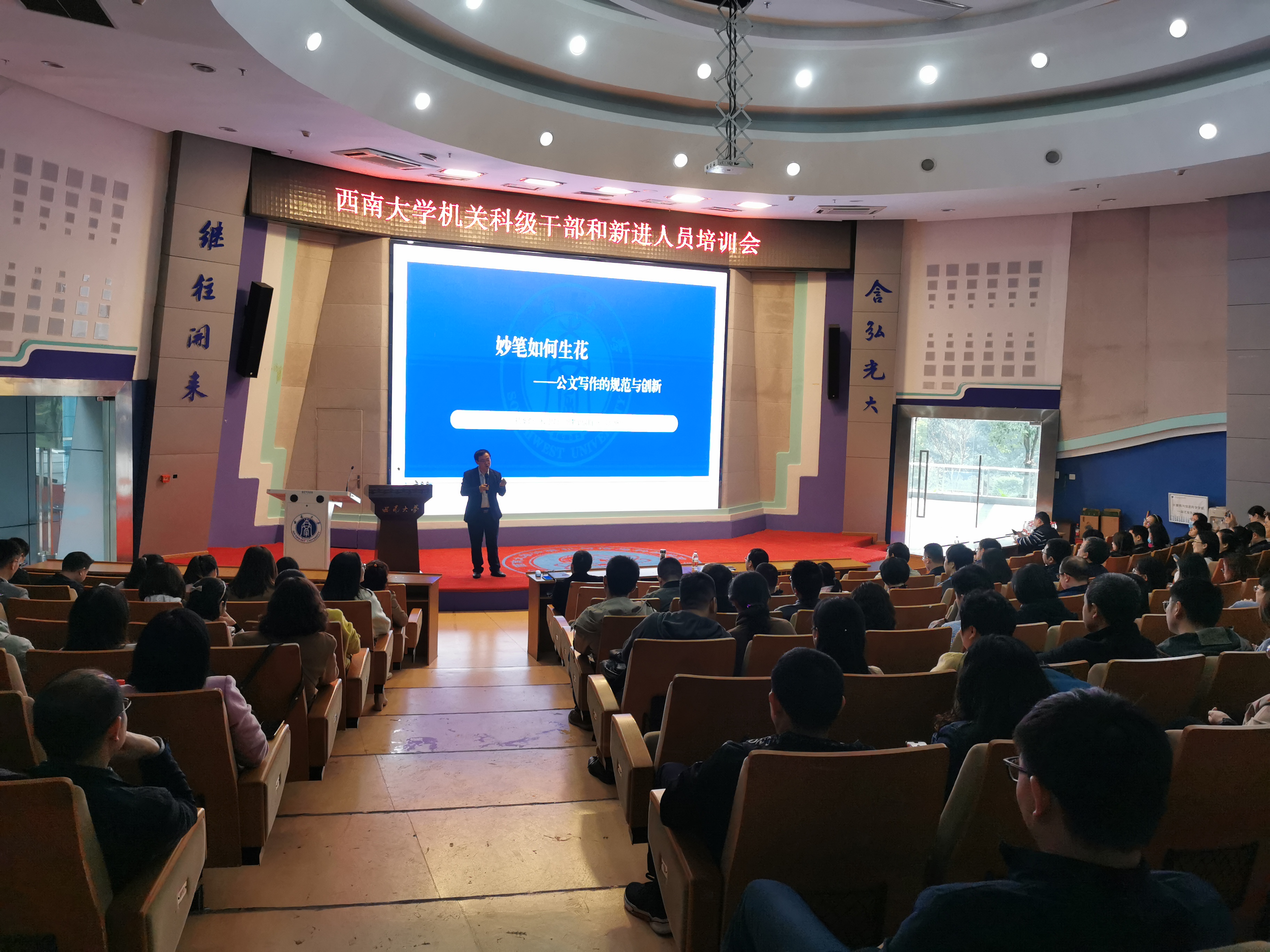 本次活动邀请到档案馆、校史馆、博物馆副馆长郑劲松同志就公文写作技巧为全体参会人员做了专题培训。会上,郑老师分别从公文写作的价值、公文的新条例新变化、公文的规范与创新以及撰写各类公文的技巧等方面生动的讲解了妙笔如何生花,让大家更进一步了解公文写作的技巧如何融入我们平时的工作。