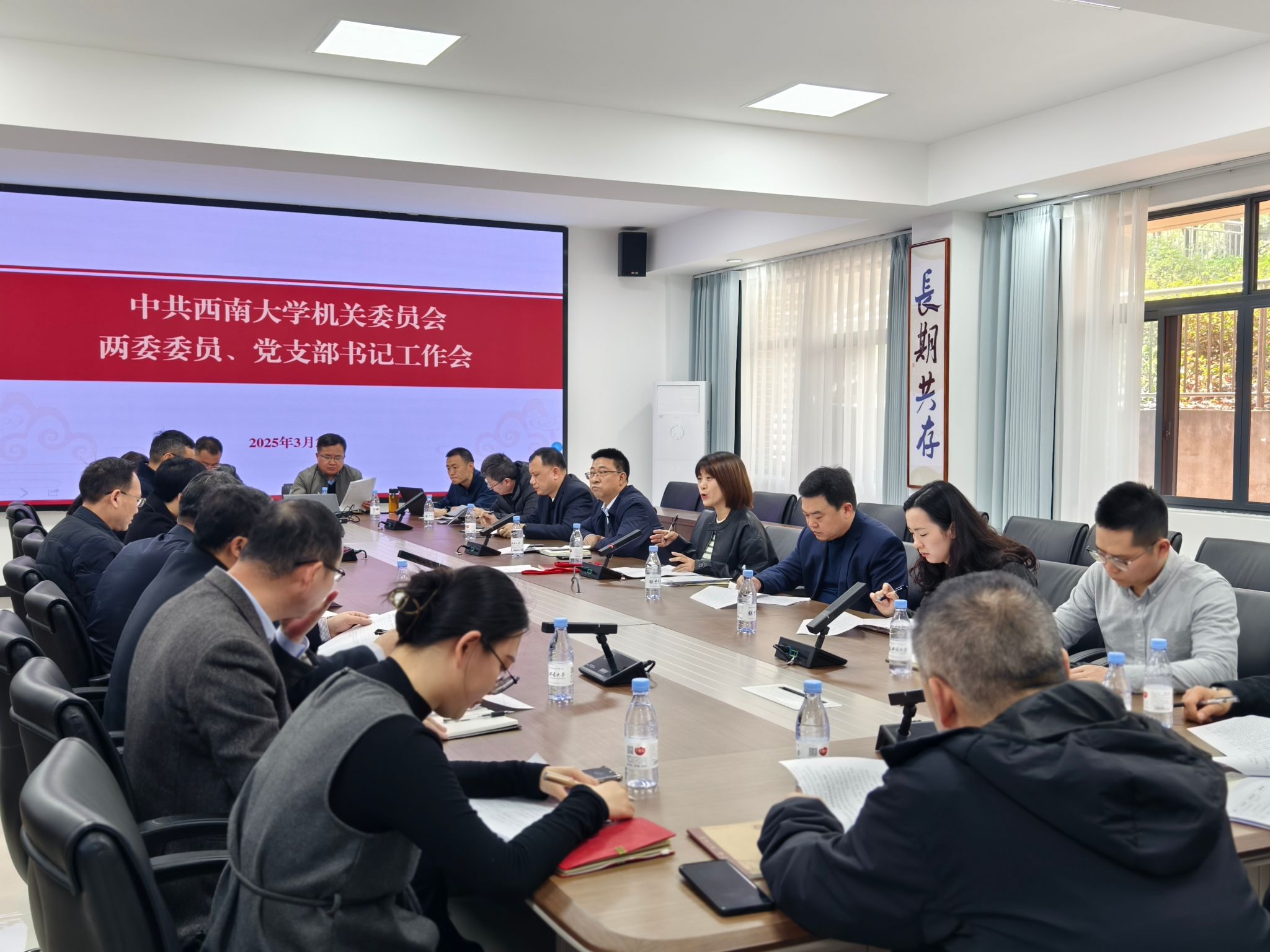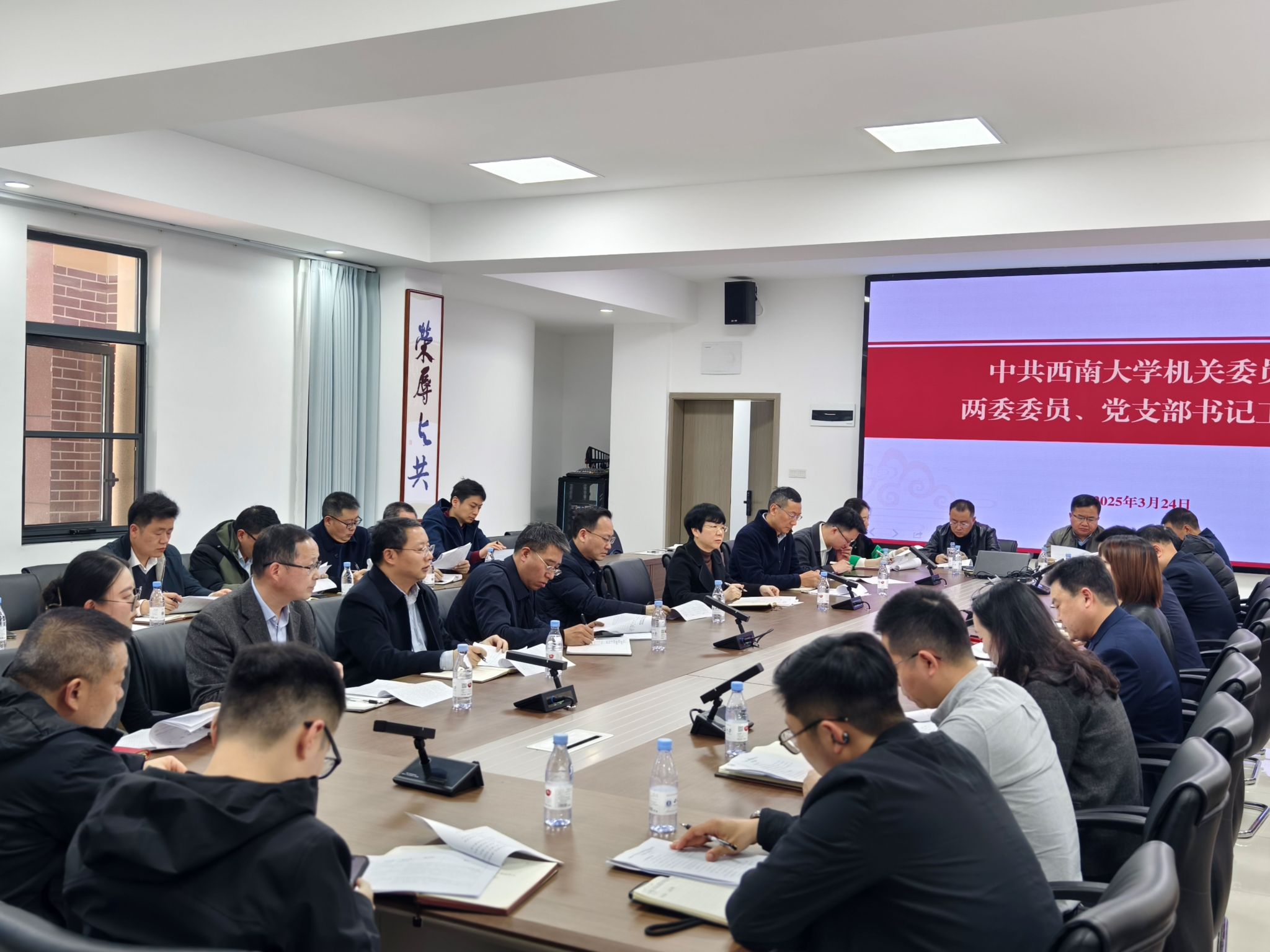 324日,机关党委召开两委委员、党支部书记工作会,专题部署学校第四次党代会代表选举工作和深入贯彻中央八项规定精神学习教育。机关党委书记万劲主持会议,机关党委委员、纪委委员、各党支部书记参加会议。