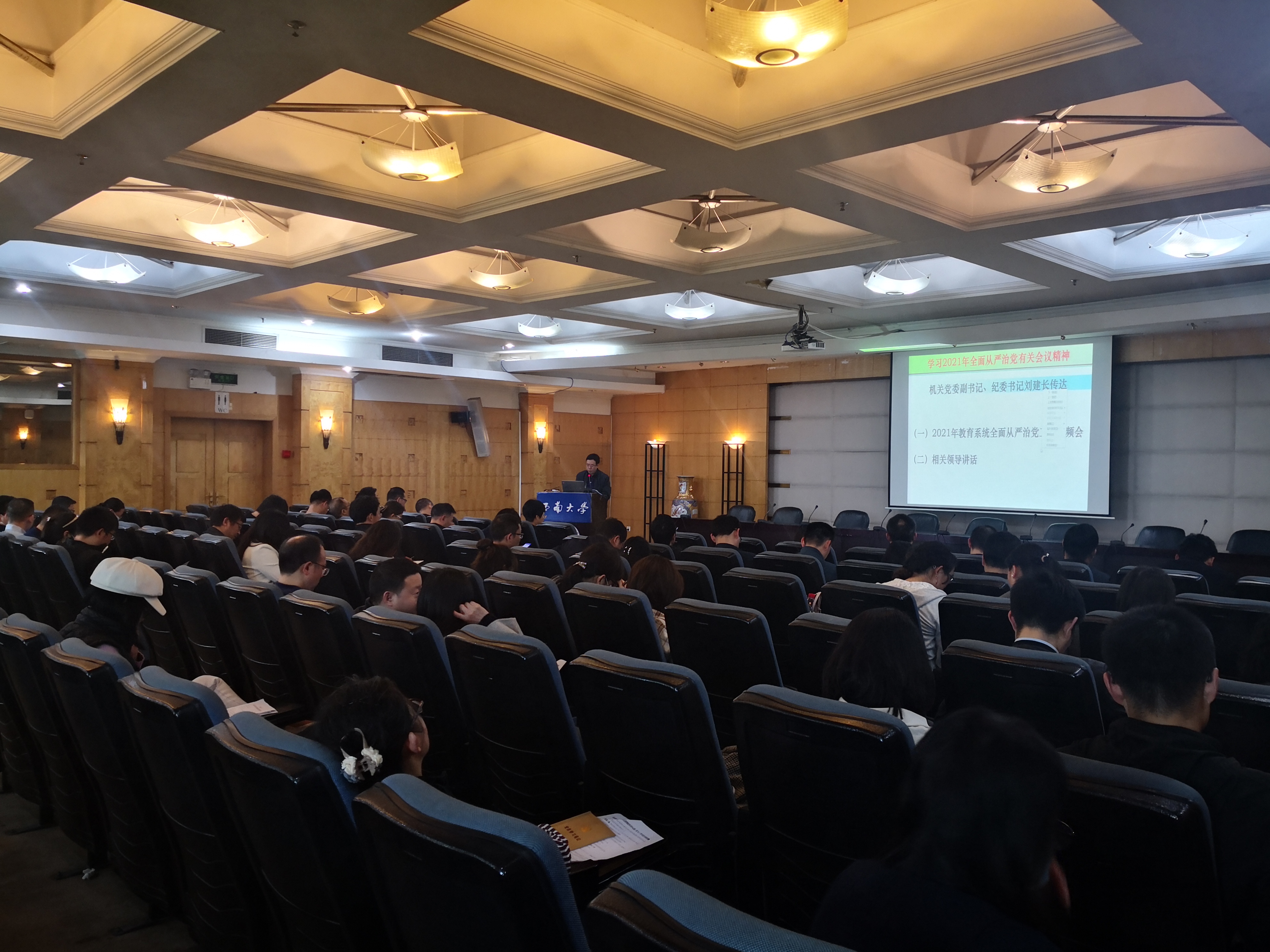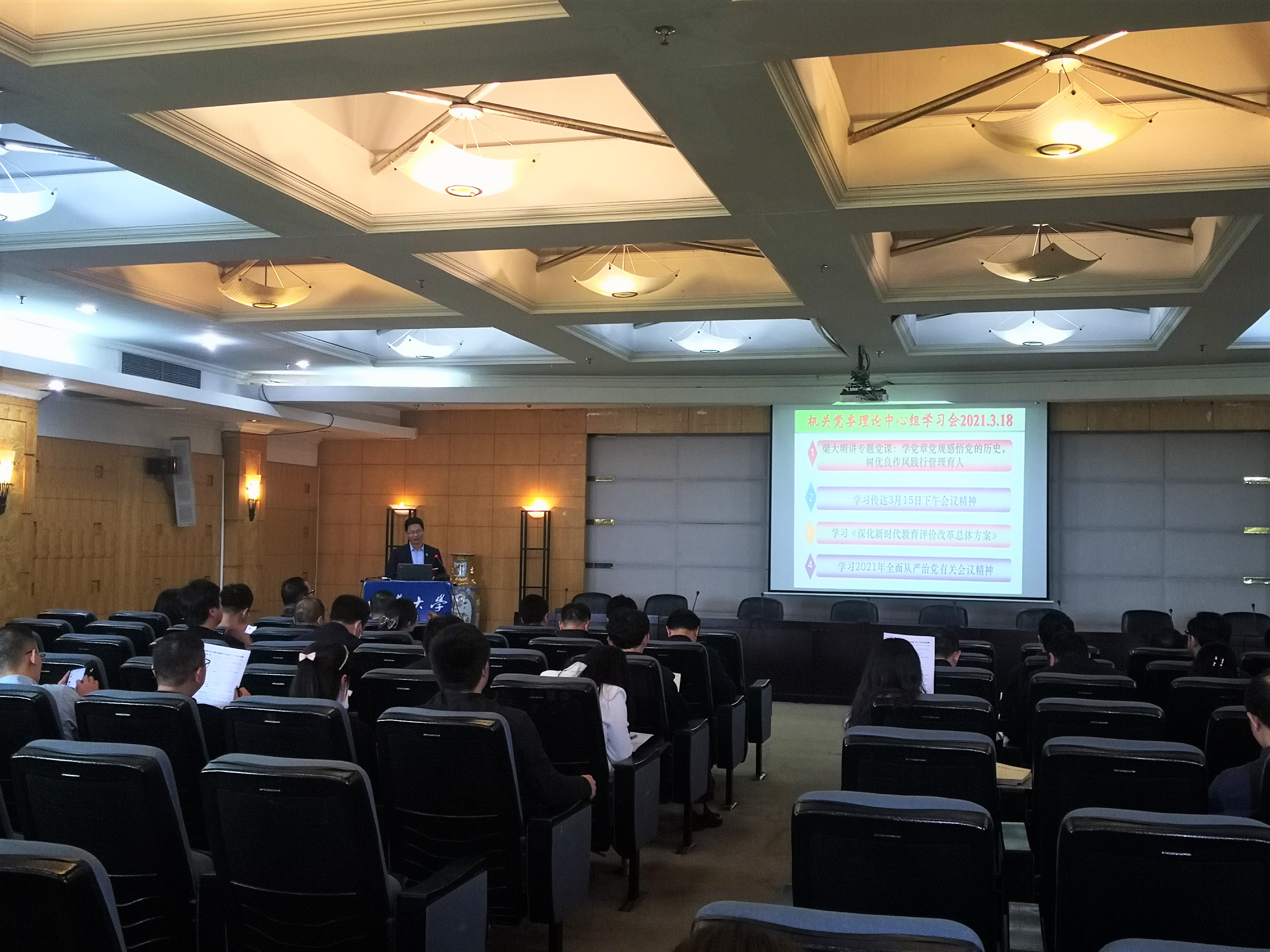 2021318日下午,机关党委理论学习中心组学习扩大会议在田家炳8楼涵慧厅召开,机关党委常务副书记梁大明同志讲了题为《学党章党规感悟党的历史,树优良作风践行管理育人》的专题党课。