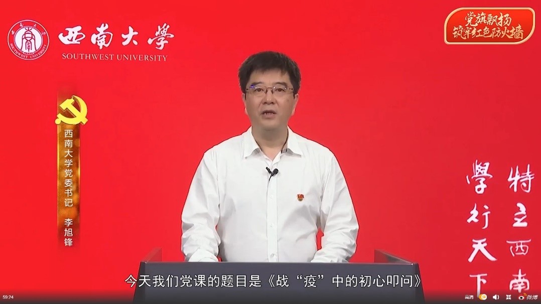 814日,学校党委书记李旭锋面向党员师生讲授了一堂题为《战“疫”中的初心叩问》专题微党课。此次微党课是经教育部党组批准,在常态化疫情防控中加强高校基层党建“四个一”行动之一,是高校党组织战“疫”示范微党课第8讲,在光明网、新华网、教育部“微言教育”政务新媒体等众多平台同步播出。
