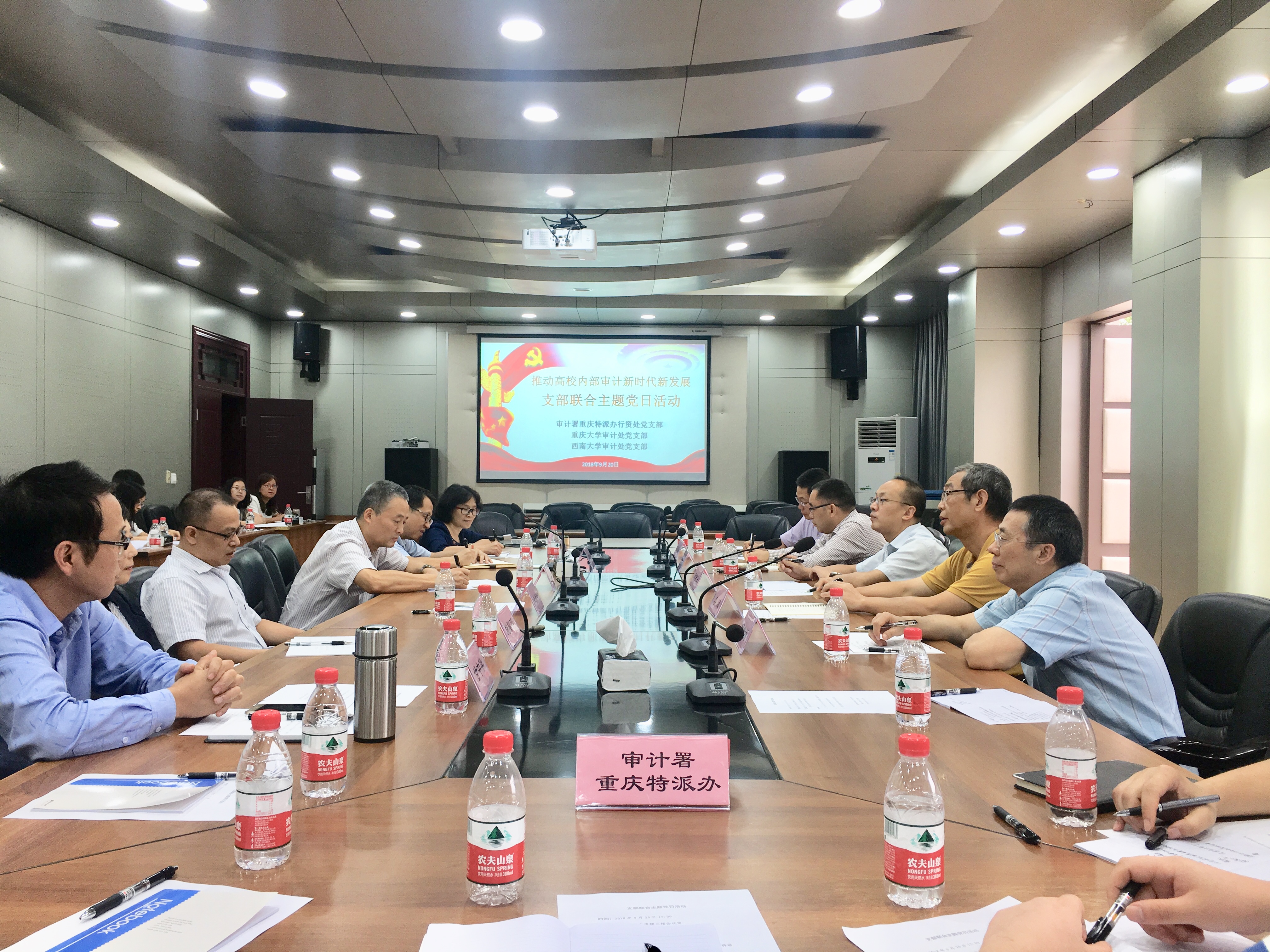 2018年9月20日下午,审计署重庆特派办行政事业与资源环保审计处党支部、重庆大学审计处党支部、betway88西汉姆网页审计处党支部,以“学习习近平总书记重要讲话精神,推动高校内部审计新时代新发展”为主题,在betway88西汉姆网页联合开展了主题党日活动。审计署重庆特派办副特派员籍吉生出席活动,betway88西汉姆网页党委副书记、纪委书记李华主持活动。