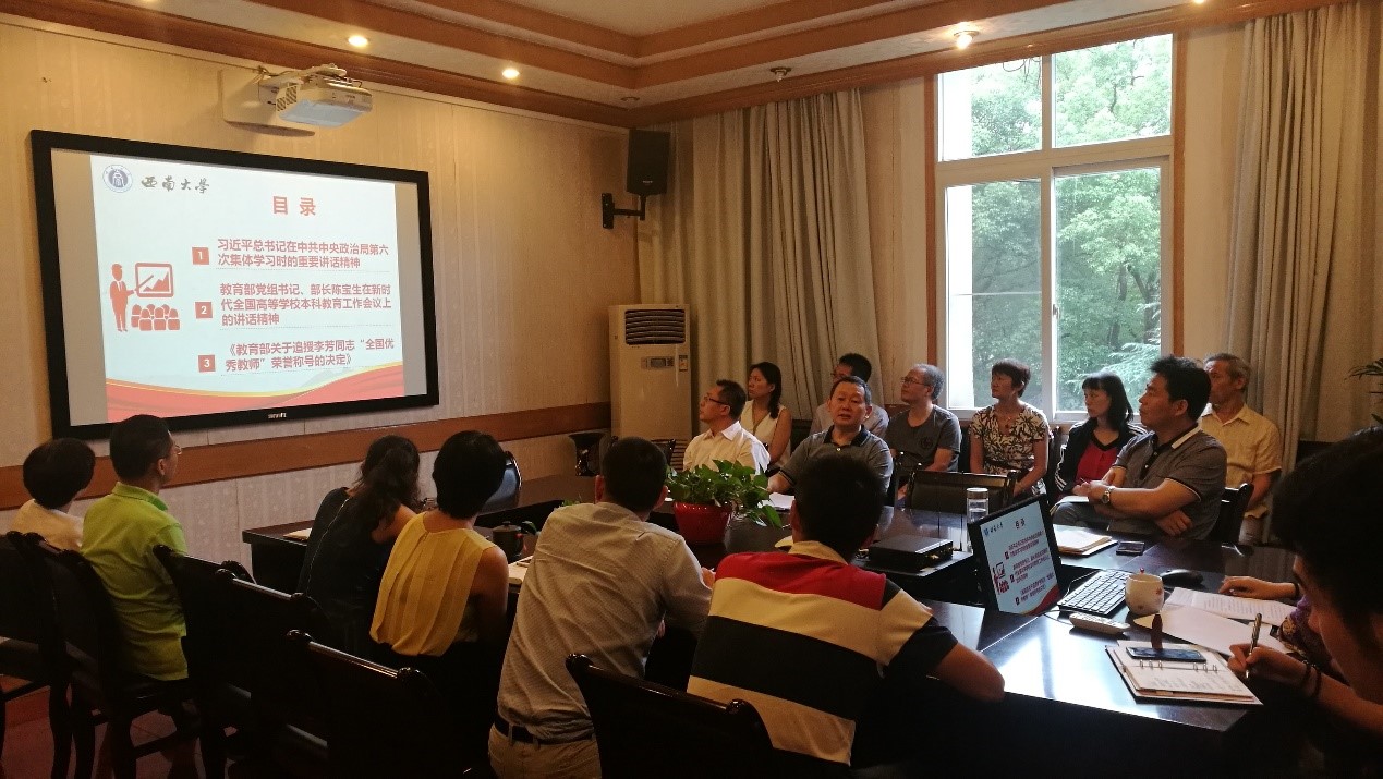 随后,吴能表处长引导全体职工学习习近平总书记在中共中央政治局第六次集体学习时的重要讲话精神以及《教育部关于追授李芳同志“全国优秀教师”荣誉称号的决定》,并观看了相关视频。