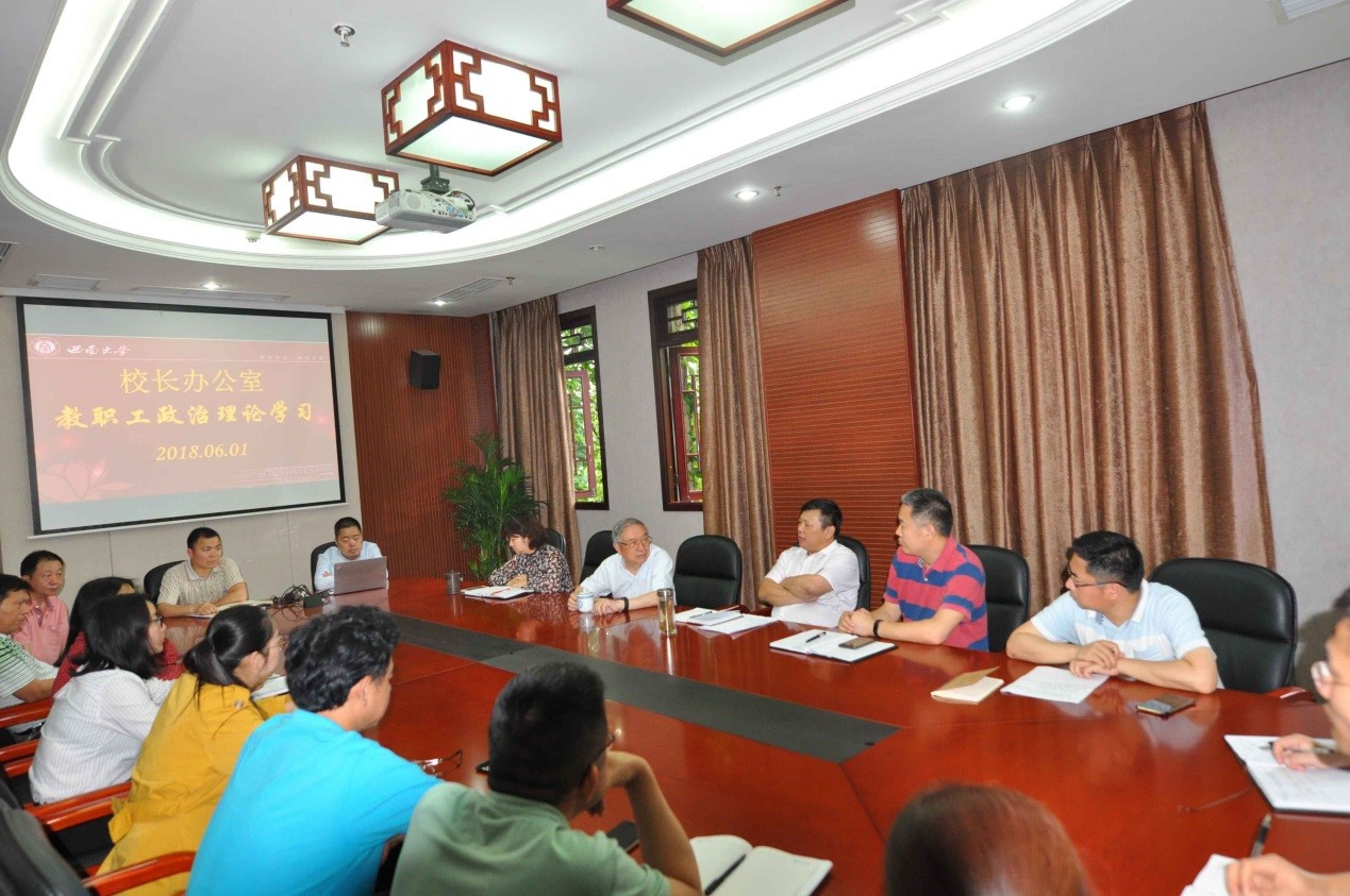 61日下午,校长办公室召开政治理论学习活动,专题学习习近平总书记在中国科学院第十九次院士大会、中国工程院第十四次院士大会上的讲话精神。张卫国校长、向仲怀院士出席会议,校长办公室全体职工参加学习。