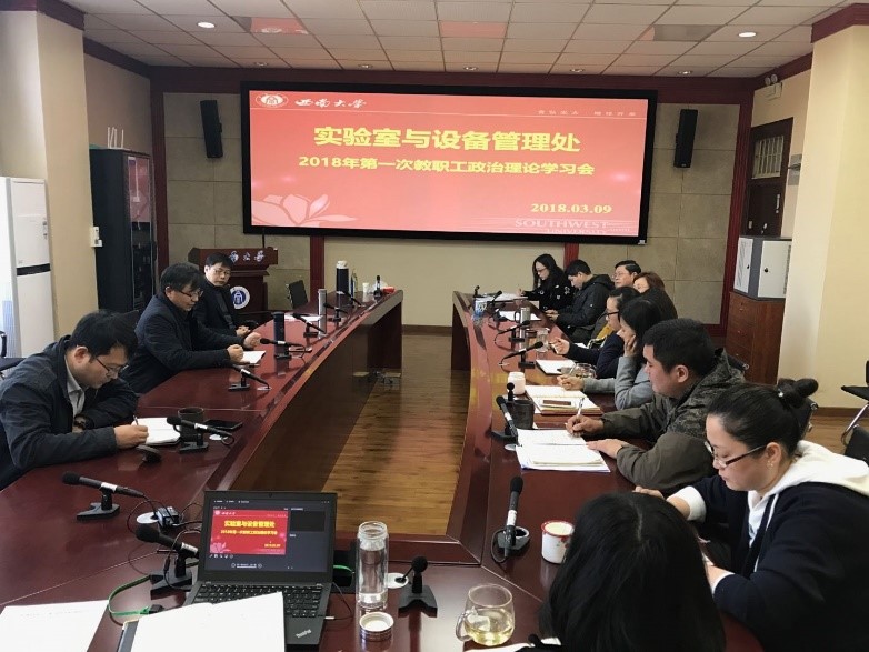 根据学校统一部署,2018年3月9日下午,实验室与设备管理处组织全体教职工在南区行政楼0208会议室开展2018年第一次政治理论学习会。会议由支部书记罗书强副处长主持。