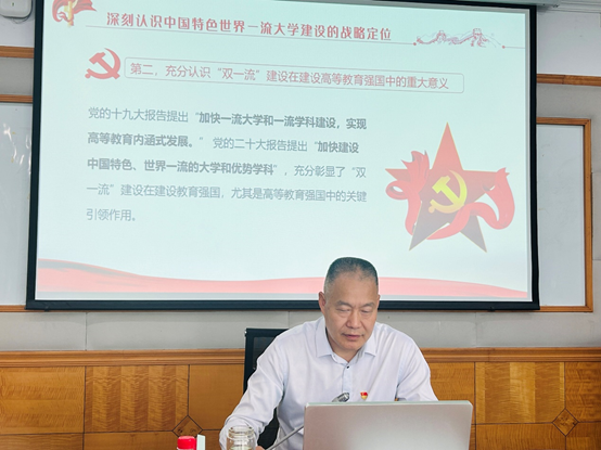 首先,党委常委、副校长葛信勇同志讲授《深入学习习近平总书记关于中国特色世界一流大学重要论述,不断提升学校“双一流”建设质量》专题党课。他从“深刻认识中国特色世界一流大学建设的战略定位”“深刻把握中国特色世界一流大学建设的丰富内涵”“深刻践行中国特色世界一流大学建设的重要使命”三个方面与大家进行了交流,带领大家对教育在党和国家事业中的基础性、先导性、全局性地位,及“双一流”建设在建设高等教育强国中的重大意义进行了再学习、再认识,强调了建设中国特色世界一流大学要以党的全面领导为根本保证、以扎根中国大地办大学为根本遵循、以立德树人为根本任务、以服务国家重大战略需求为根本导向,并对深入推进学校“双一流”建设质量提升做出了进一步部署。